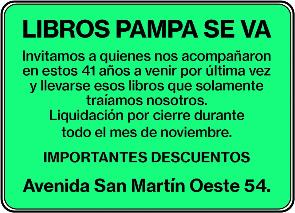 Libros Pampa está de liquidación por cierre. Por cierre posta, no como en la calle Corrientes de Buenos Aires donde hay locales que ponen la bandera como táctica de venta nomás. Y yo no pienso ir. Es como para el hincha al que le cierran la cancha. Y bueno, estas son mis pasiones.