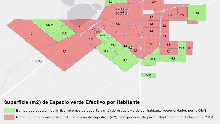 Pueblos Originarios, Barrio Sur y Zona Centro son los que tienen más superficie de “Espacios Verdes Efectivos”. Solo 16 barrios superan el valor recomendado por la OMS en este rubro. Por el contrario, aquellos ubicados en la zona oeste de la capital pampeana y el Nelson Mandela son deficitarios en este aspecto. El Faro, Esperanza y Villa Germinal tienen registros por debajo del recomendado teniendo en cuenta la superficie de «Espacios Verdes Efectivos» por habitante.