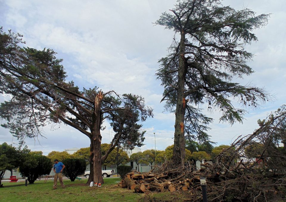 Los fuertes vientos derribaron en la mañana del sábado parte de dos pinos de la plaza San Martín, de la localidad de Caleufú. Personal municipal trabajó para cortar y retirar troncos.