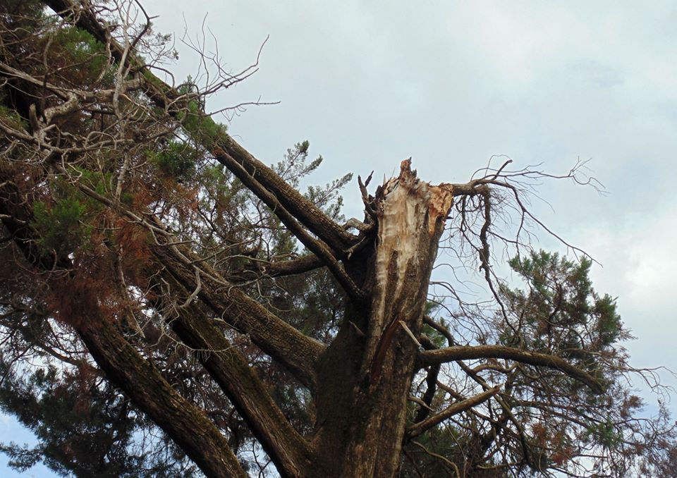El viento derribó parte de dos pinos de la plaza de Caleufú
