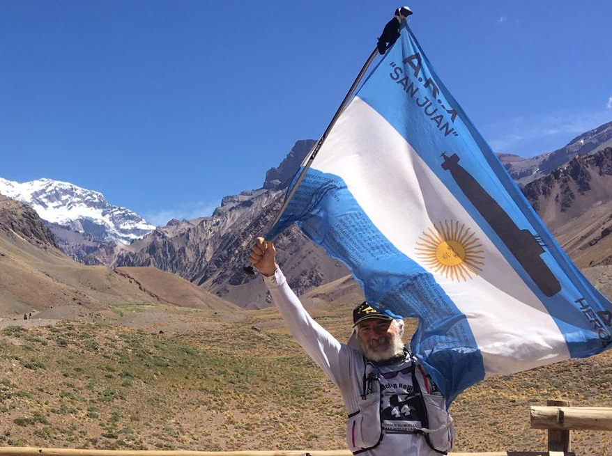 “A pesar de mis 64 años, intentaré, al cumplirse dos años de la última zarpada desde la Base Naval Mar del Plata (sábado 26 de octubre 2019), a modo de un homenaje diferente trasladarme desde ese muelle, sin la utilización de ningún medio mecánico (trotando-caminado) una bandera argentina con los nombres de los 44 submarinistas hasta la cumbre del cerro Aconcagua en Mendoza”, se propuso el excomandante.