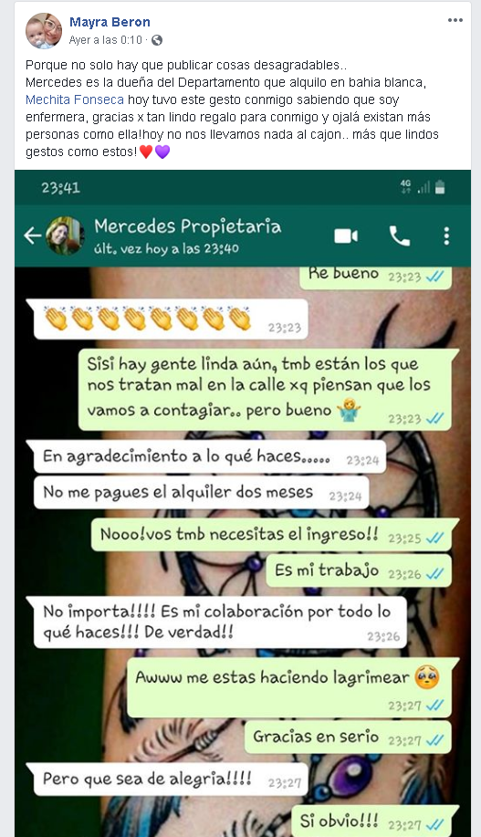 Fue la misma Mayra quien publicó la noticia en su Facebook personal, donde le agradeció a la dueña. «Porque no solo hay que publicar cosas desagradables. Mercedes es la dueña del Departamento que alquilo en Bahía Blanca, Mechita Fonseca hoy tuvo este gesto conmigo sabiendo que soy enfermera, gracias por tan lindo regalo para conmigo y ojalá existan más personas como ella! hoy no nos llevamos nada al cajon.. más que lindos gestos como estos».