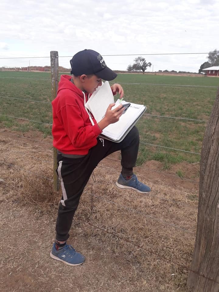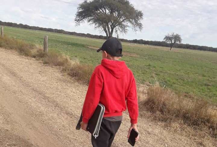 Axel Andrada Altamirano es alumno de primer año de Técnica Agropecuaria, en el Instituto Rancul. Vive en el campo con su familia, tiene que hacer el aislamiento muy lejos del colegio y todos los días debe recorrer unos 4 kilómetros por día para lograr tener señal en su teléfono celular, conectarse a internet y hacer las tareas.