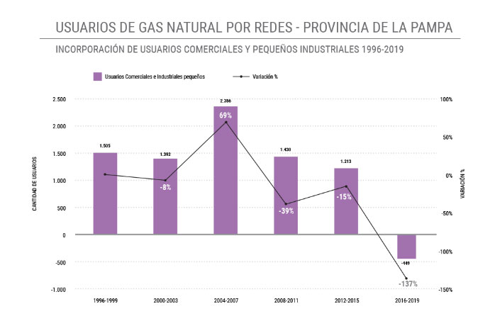 Entre 2016 y 2019 en La Pampa no sólo no se incorporaron nuevos usuarios Comerciales e Industriales Pequeños sino que prevalecieron las desconexiones al servicio.
