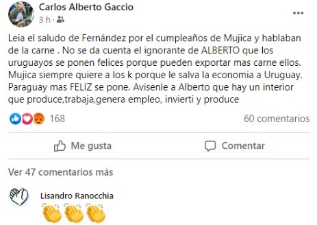 ¿Qué dijo? “Leía el saludo de Fernández por el cumpleaños de (José) Mujica y hablaban de la carne . No se da cuenta el ignorante de Alberto que los uruguayos se ponen felices porque pueden exportar mas carne”, escribió. “Mujica siempre quiere a los k porque le salva la economía a Uruguay. Paraguay mas feliz se pone. Avísenle a Alberto que hay un interior que produce, trabaja, genera empleo, invierte y produce”, finalizó.