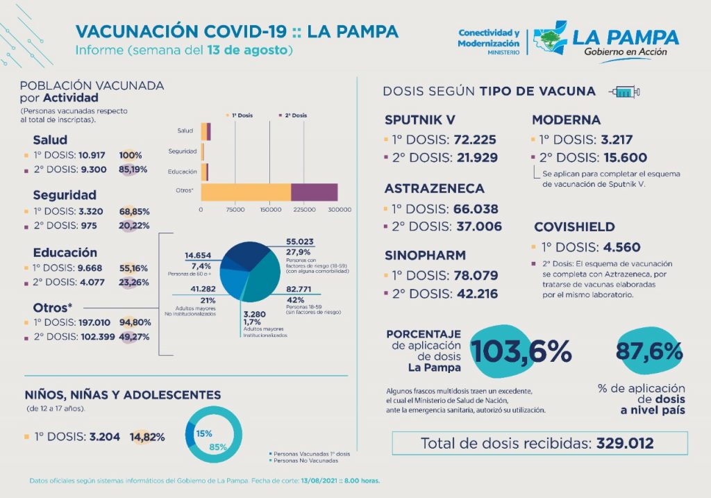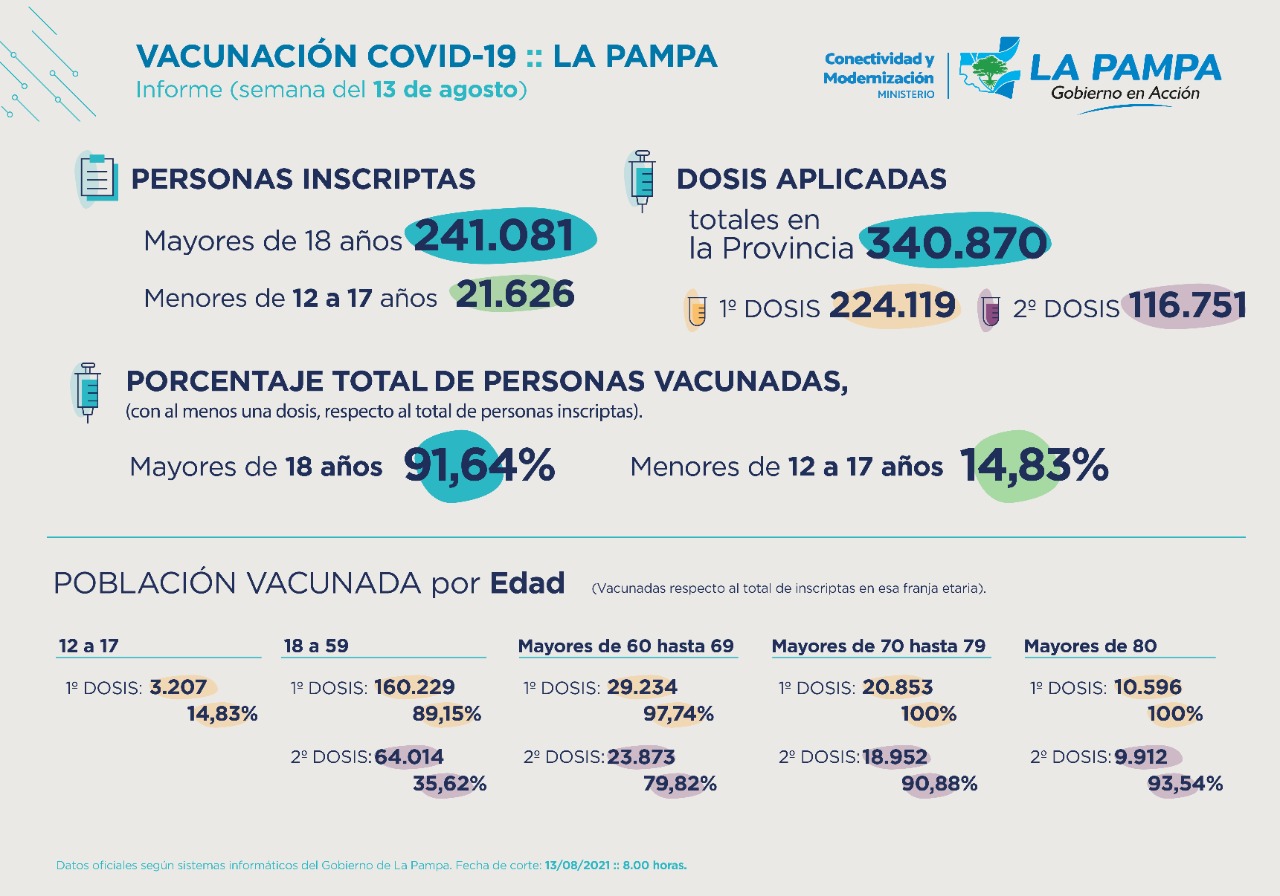 El Poder Ejecutivo Provincial, a través de los Ministerios de Conectividad y Modernización, y de Salud, informó en los cuadros estadísticos la marcha del Plan de Vacunación contra la Covid-19 en la provincia de La Pampa al día de la fecha.