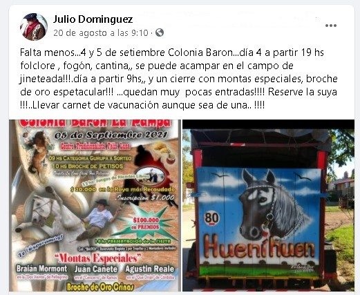 En ese marco, ya se anunciaron festivales en diferentes puntos. La mayoría, con “pase sanitario”. Entre ellas, la jineteada, espectáculo musical y fogón para el sábado 4 y domingo 5 de septiembre en el pueblo de Colonia Barón.