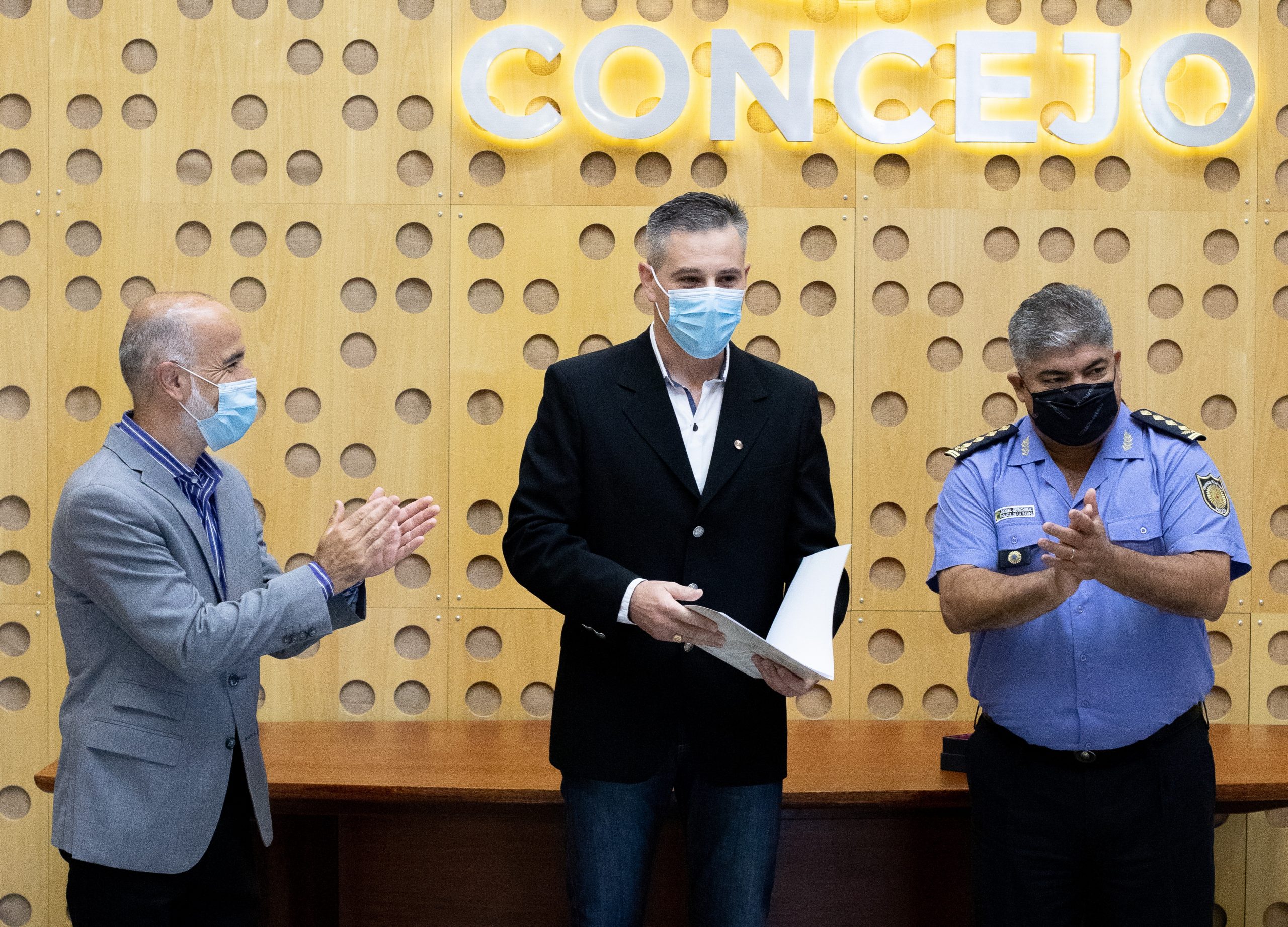 El presidente del CD, Daniel López, entregó el decreto mediante el cual se destaca y reconoce la conducta del subcomisario Arias. Luego, la mamá del nene, Yanet Funes, realizó la entrega de una placa de reconocimiento.