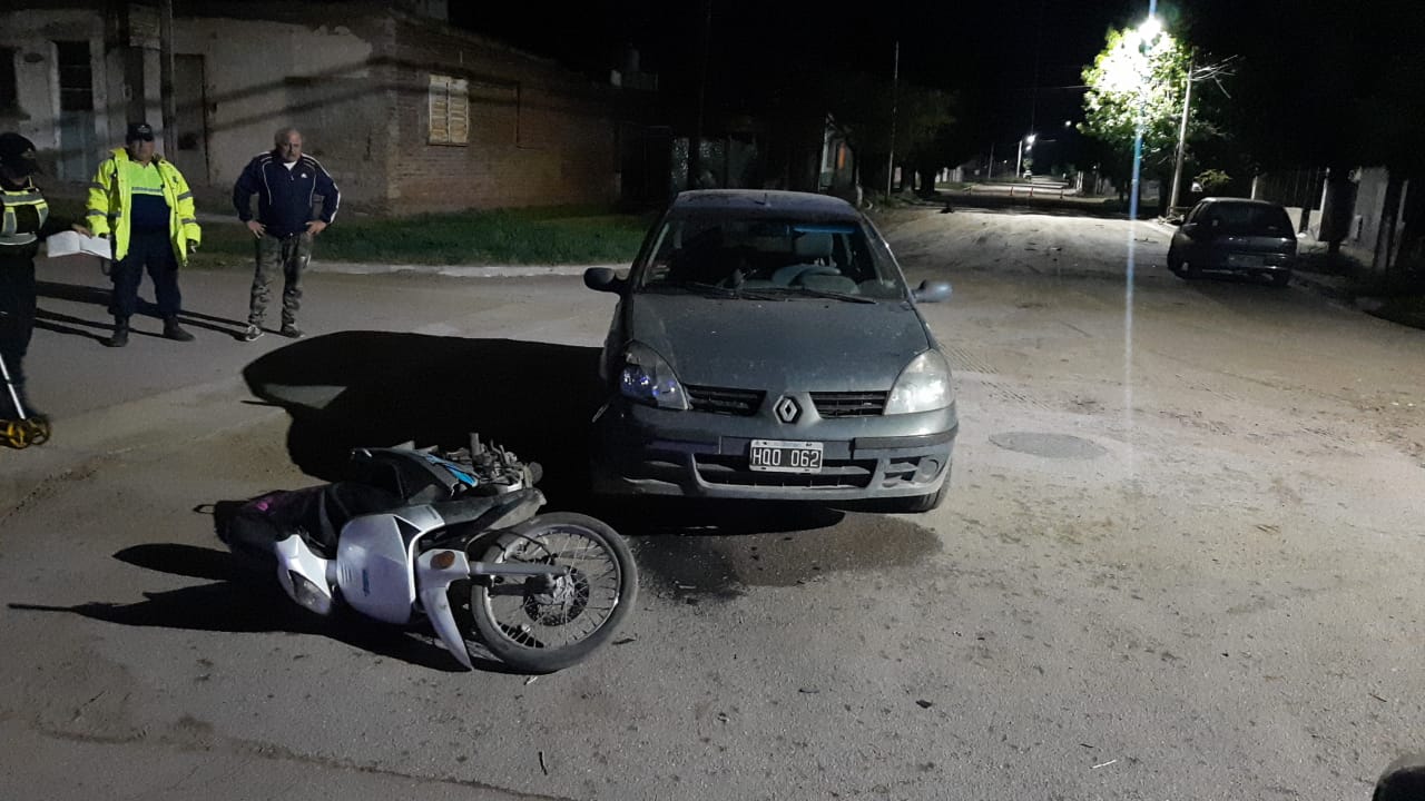 Un motociclista sufrió la quebradura de la tibia y peroné en una de sus piernas luego de chocar, el domingo a la noche, con un auto en la esquina de Guatraché y Castex, en Santa Rosa. El dato destacado es que los dos dieron positivo en el test de alcoholemia.