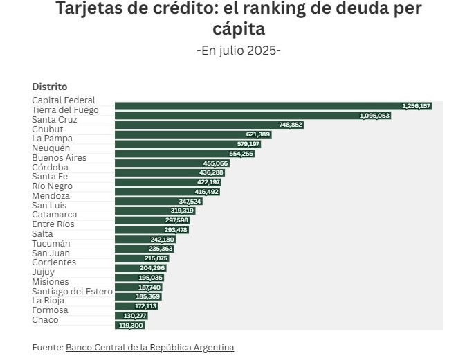 En este contexto, informó el portal Chequeado, la Ciudad de Buenos Aires, Tierra del Fuego, Santa Cruz, Chubut y La Pampa son los cinco distritos en los que se registran los mayores niveles de deudas con tarjetas de crédito por cantidad de habitantes.