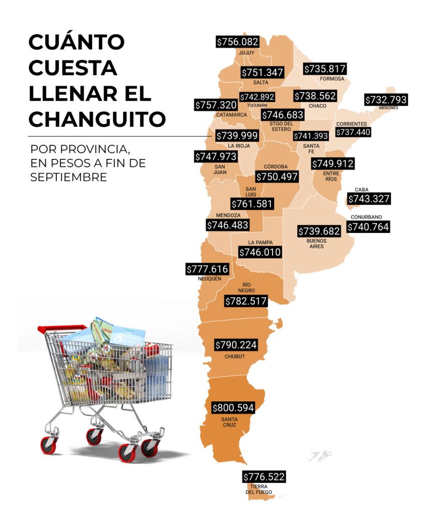 Un informe de la consultora Analytica reveló que llenar el changuito de supermercado en La Pampa cuesta $746.000. El más caro corresponde a Santa Cruz, con $800.594, seguido por Chubut ($790.224), Río Negro ($782.517), Neuquén ($777.616) y Tierra del Fuego ($776.522).