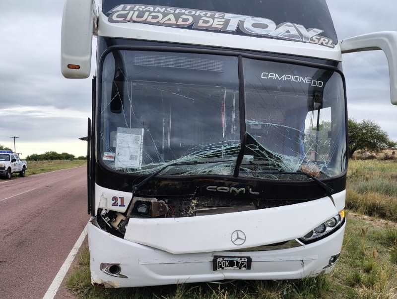 El siniestro ocurrió a las 5 de la madrugada, a unos 15 kilómetros al sur del Puesto Caminero el Durazno. “El personal policial constató que una pickup marca Toyota y un colectivo habían colisionado con el animal. En el lugar se hizo presente personal de la Posta Sanitaria de Carro Quemado a brindar los primeros auxilios”, contaron fuentes de la causa. “En la Toyota que circulaba de norte a sur iba al mando de un masculino que resultó sin lesiones y en el colectivo lo hacían un grupo de 47 personas, entre alumnos de 16 a 17 años y profesores, no resultando ninguno herido. Los estudiantes son de la ciudad de Santa Rosa y un colectivo de la empresa los busco para continuar el viaje de regreso”.