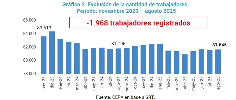 La cantidad de trabajadores registrados en unidades productivas cayó de 83.613 a 81.645, lo que representa una merma del 2,4%.