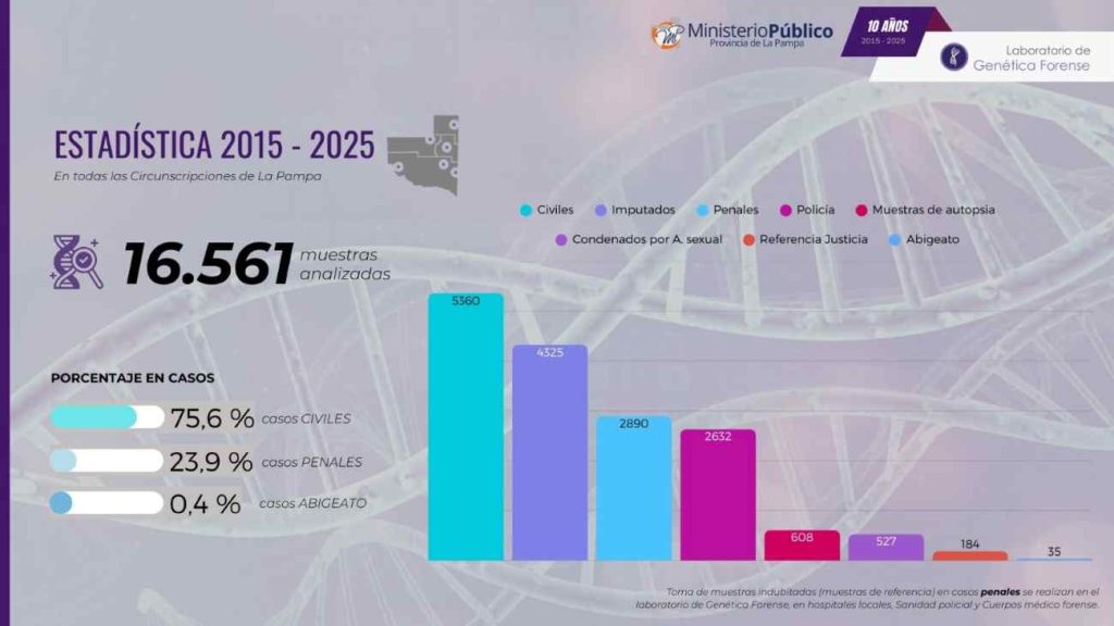 A lo largo de esta década, el laboratorio analizó unas 16 mil muestras en casi 2.500 casos, con lo que se consolidó como una herramienta científica esencial para el esclarecimiento de delitos y la resolución de determinaciones de vínculos biológicos -como paternidad, abuelidad o media hermandad- en el ámbito civil.