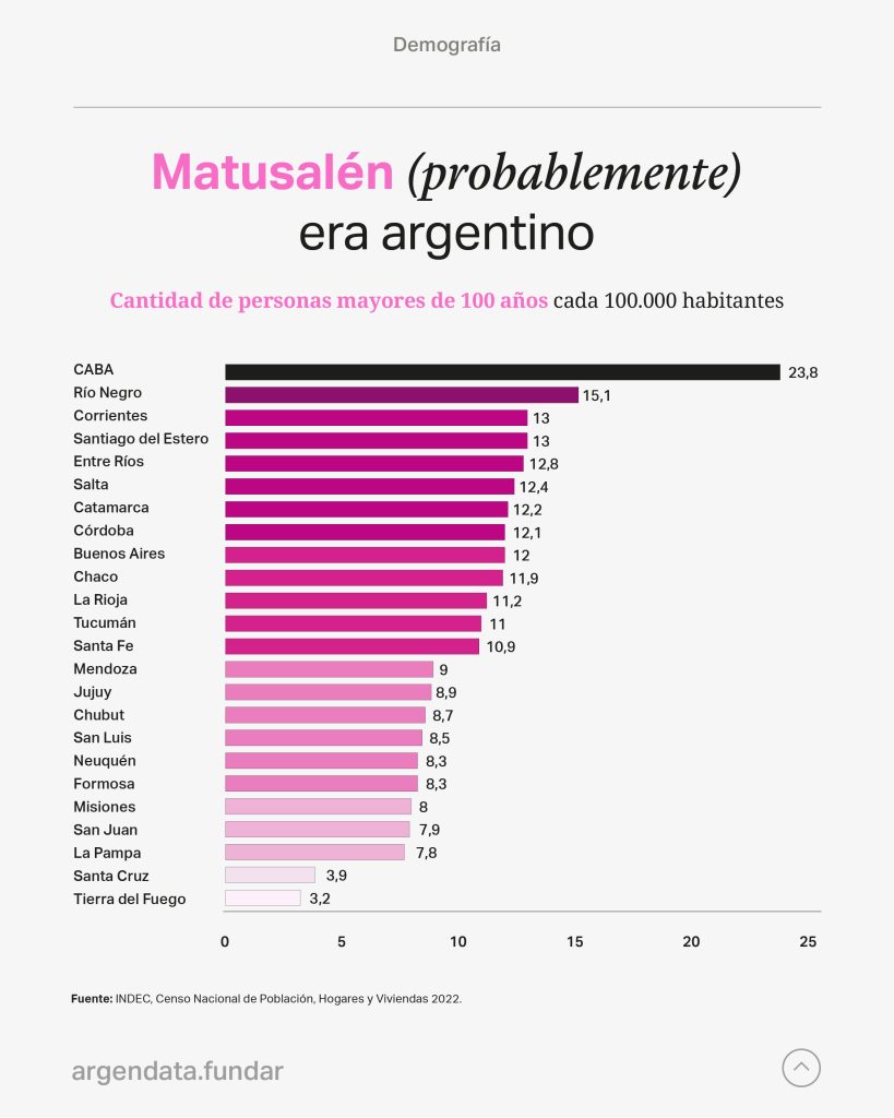 Detrás de CABA se ubica Río Negro con 15 personas mayores de 100 años cada 100 mil habitantes. Completas el podio Corrientes y Santiago del Estero, con 13.