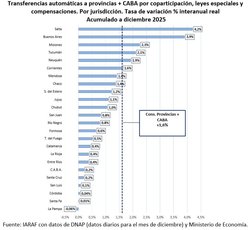 A nivel nacional estas transferencias terminaron el año 2025 con una suba real interanual del 1,6%. Al analizar el desempeño entre jurisdicciones, se observa que Salta, Buenos Aires, Misiones, Tucumán, Neuquén y Corrientes tuvieron un incremento real interanual superior al promedio de las 24 jurisdicciones. El principal elemento que impulsó este diferencial respecto a las demás jurisdicciones se debe al significativo incremento real interanual de los envíos por compensaciones del 80% y a la elevada participación de estas provincias en dichos envíos, informó el Iaraf.