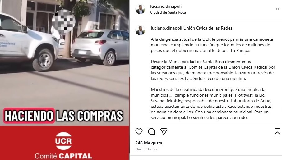 Pero poco después, el jefe comunal dijo que todo fue una “fake news” de los radicales y los cuestionó duramente. “Es la Unión Cívica de las Redes”, les dijo por las redes sociales. “A la dirigencia actual de la UCR le preocupa más una camioneta municipal cumpliendo su función que los miles de millones de pesos que el gobierno nacional le debe a La Pampa”.