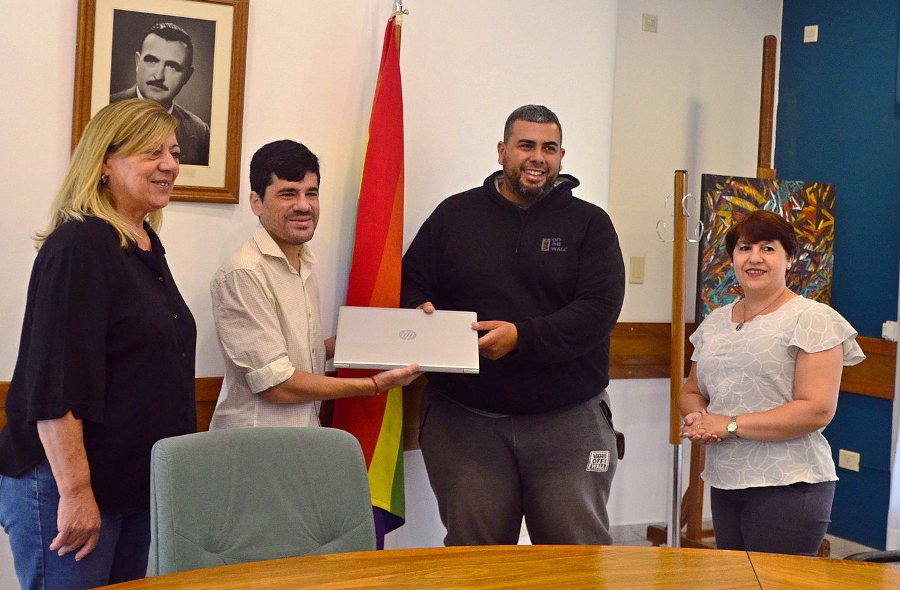 El presidente del consejo de administración de la CPE, Manuel Simpson, encabezó un acto de entrega de una notebook a la Coopecad, junto a la secretaria Silvina Reynoso y la consejera María Eugenia González. Alan González, presidente de la cooperativa que nuclea a los trabajadores relacionados a la cadetería, recibió la computadora portátil.
