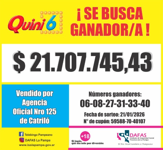 “Una persona que compró un cupón en la Agencia Oficial 125 de Catriló, acertó con los números 06, 08, 27, 31, 33 y 40 y ganó ¡¡21.707.745,43 pesos!!, en el sorteo que se realizó el 21 de enero de 2026.