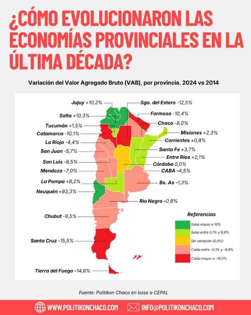 La Pampa ha sido una de las pocas provincias que logró crecer en una década atravesada por crisis permanentes. Según un informe sobre la evolución de la economía en las provincias, elaborado por la consultora Politikon Chaco con base en Cepal, mientras entre 2014 y 2024 gran parte del país se estancó o retrocedió, la economía pampeana mostró una evolución positiva, basada en su fortaleza productiva, su entramado social y la presencia de un Estado eficiente. El crecimiento fue del 8,2 %.