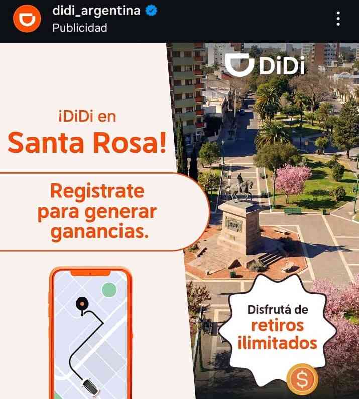 A través de sus redes sociales anunció su desembarco en Santa Rosa. “¡Didi en Santa Rosa!. Registrate para generar ganancias. Disfrutá de retiros ilimitados”, dice el mensaje de la empresa.