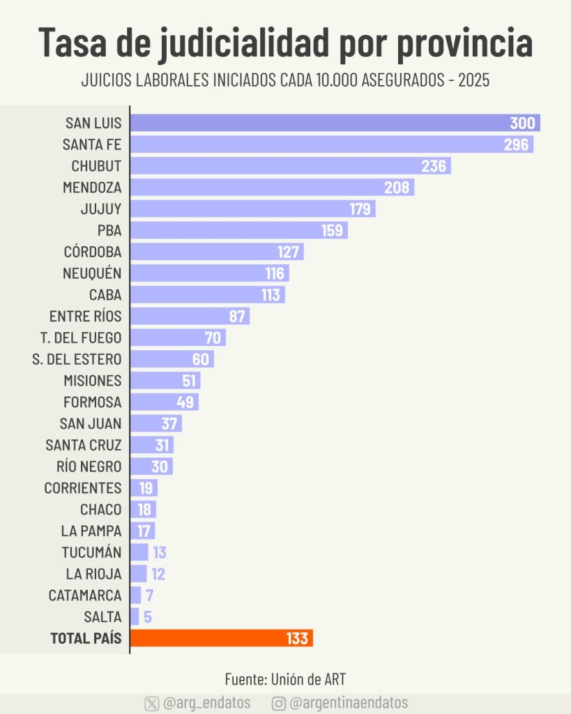 Las provincias con mayor tasa de juicios fueron San Luis (300), Santa Fe (296) y Chubut (236); mientras que Salta, Catamarca y La Rioja tuvieron 5, 7 y 12 juicios cada 10 mil asegurados, respectivamente.