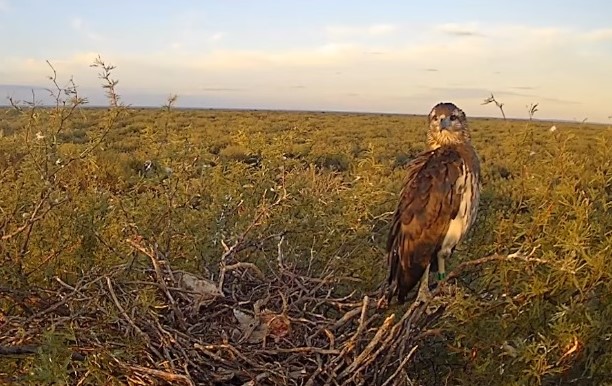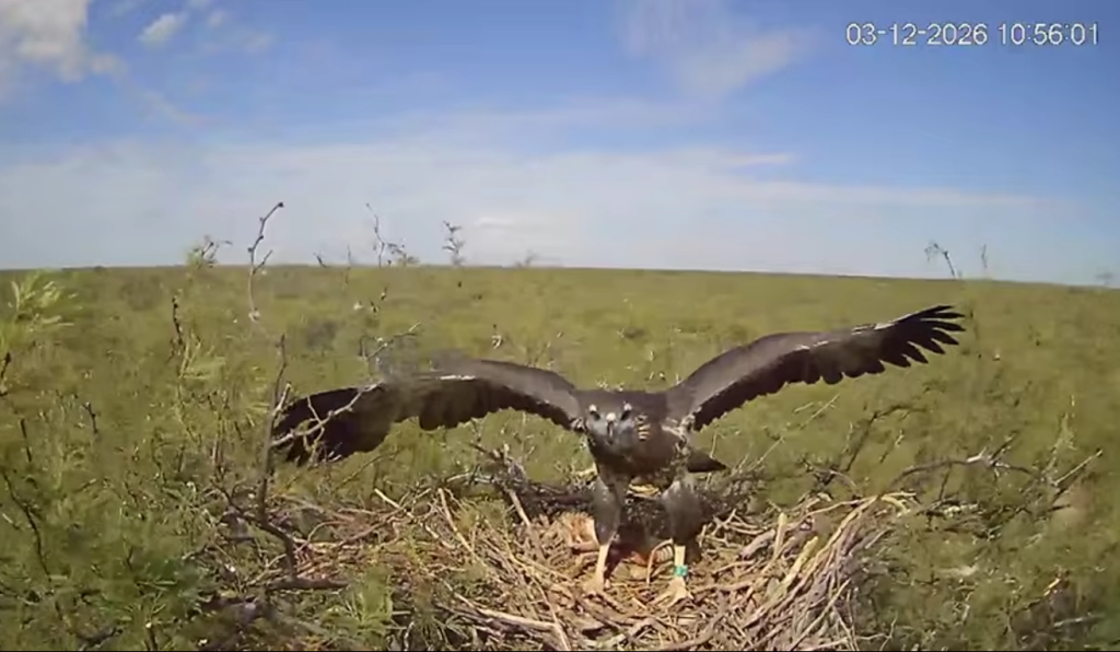 La cámara permite seguir minuto a minuto la actividad de los ejemplares en un nido ubicado en pleno caldenal pampeano. Allí se puede ver a un pichón en pleno crecimiento, que ejercita sus alas frente a los fuertes vientos mientras es alimentado por sus padres.