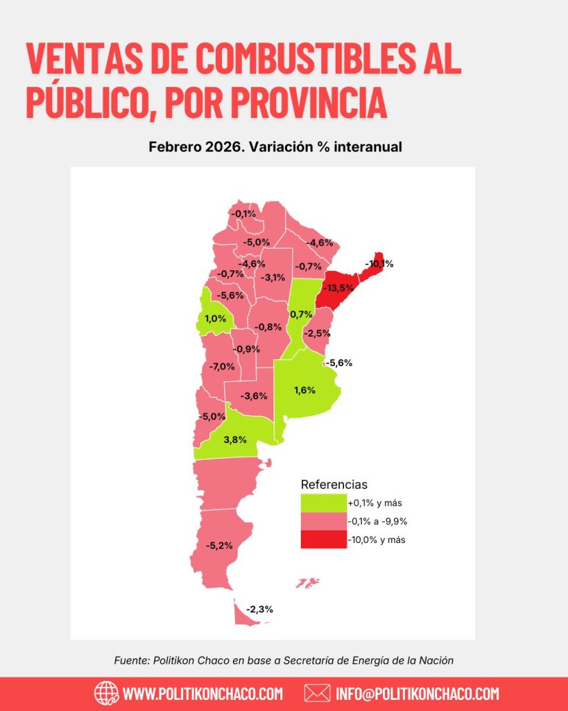 Así lo reveló un informe de la consultora Politikon Chaco. De acuerdo al estudio, en el segundo mes del año se vendieron 1,3 millones de metros cúbicos de combustibles con una caída interanual de -1,7%, siendo el peor febrero desde 2021. Solo 4 provincias crecieron con pico en Río Negro (+3,8%).