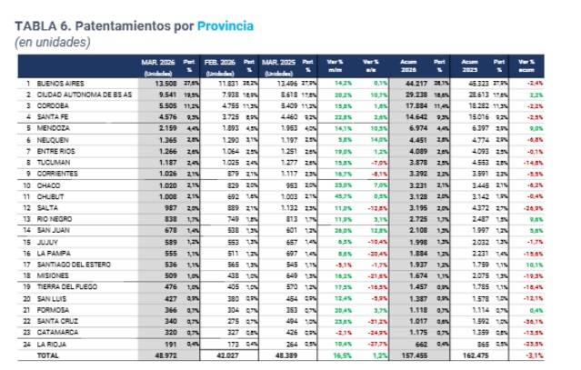 A nivel nacional, siempre según Acara, el mercado de autos 0km cerró marzo con una leve recuperación: se patentaron 48.972 vehículos, lo que implica un crecimiento del 1,2% interanual frente a las 48.389 unidades registradas en el mismo mes de 2025.